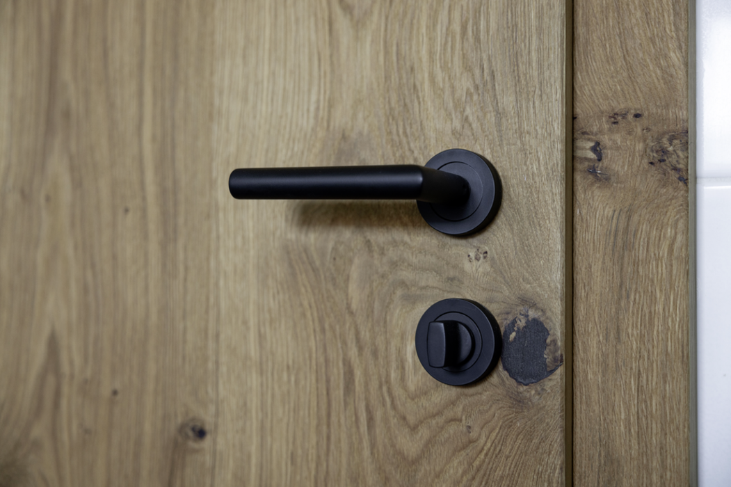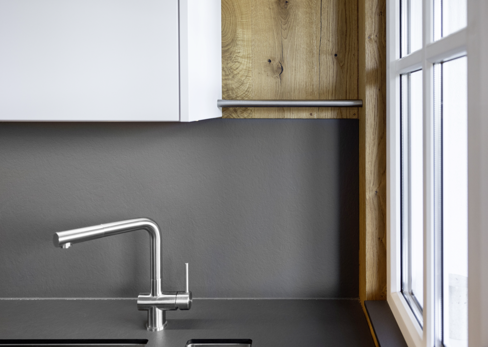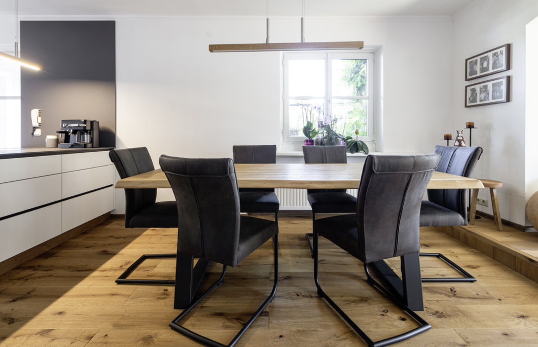 Der Eigentümer des Privathauses hat sich für rustikale Eurowood Massivholztüren aus Eiche entschieden. Eurowood – die Eigenmarke von JAF – steht für trendbewusste Produkte. Massivholztüren verleihen Räumen ein besonderes Ambiente und spiegeln die Besonderheit jedes Baumes wider, da jeder Ast und jede Flader zum Vorschein kommt. Die gewählten Türbeschläge verleihen der Tür mit ihren im matten schwarz gehaltenen Stil das gewisse Etwas. Die ansprechenden Landhausdielen von Kährs ergeben gemeinsam mit den Massivholztüren ein optisch rundes Gesamtbild. Der Parkettboden ergänzt die moderne, helle Innenausrichtung hervorragend und verleiht eine gemütliche Atmosphäre. In der Küche kamen die langlebigen, dunklen Max Plus Compact Arbeitsplatten von Fundermax im schlichten Stil zum Einsatz. Sowohl die ästhetischen Fronten von Fenix, als auch die Küchenkorpusse stammen aus der eigenen Möbelteileproduktion von JAF. Ein rustikaler Küchentisch aus Eiche ergänzt den Parkettboden perfekt mit seinem ausdrucksstarken Aussehen und bildet den gelungenen Abschluss im Renovierungsprozess.