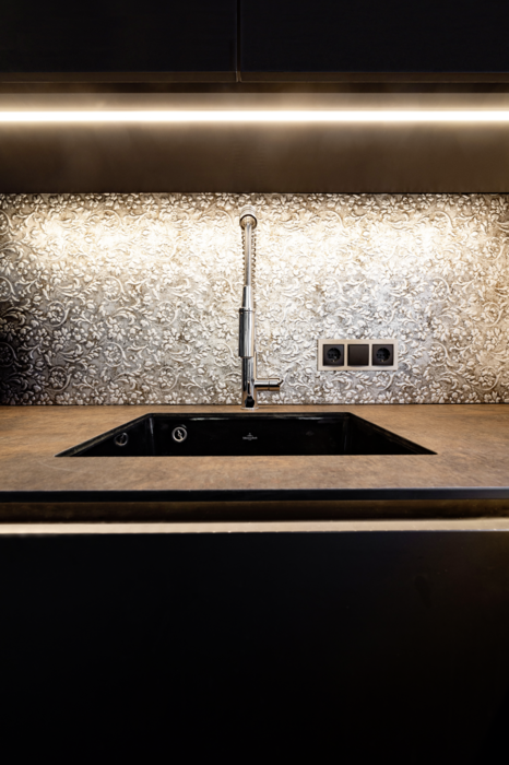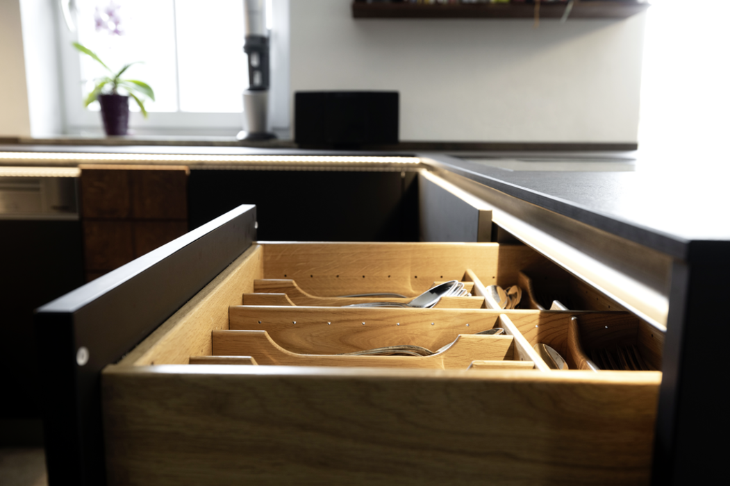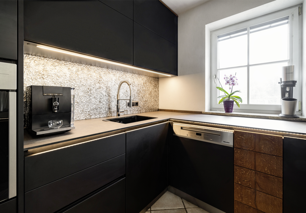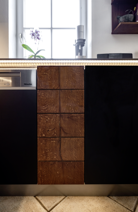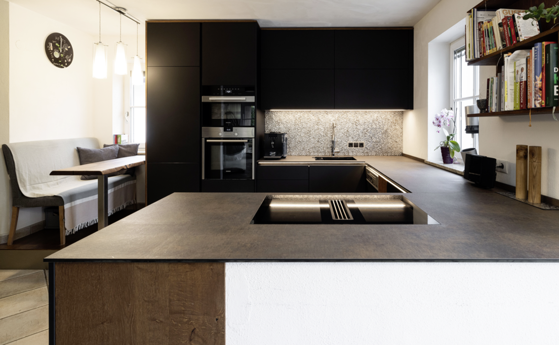 In der Küche ist die Fokussetzung auf Stil und Qualität deutlich erkennbar. Die Fronten wurden mit einer matten schwarzen Oberfläche versehen, die dem Raum eine edle Note verleiht. Verwendet wurden hochwertige Compact Platten von Fenix, die nicht nur robust sind, sondern auch ein zeitloses Design verkörpern. Korpus-Elemente aus dunklem Holz sorgen für einen ansprechenden Kontrast. Die neue Küchenarbeitsplatte ergänzt das Gesamtbild perfekt und bietet eine großzügige Fläche für kulinarische Kreationen. Mit dieser Renovierung wird die Küche zu einem Ort, an dem das Kochen zu einem wahren Vergnügen wird. Produziert wurden die Möbel direkt von JAF über das Serviceangebot JAF Möbelteile.