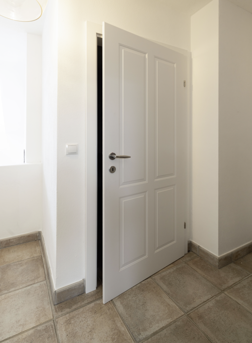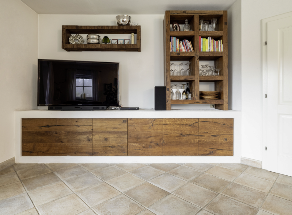 Im Esszimmer wurde ein Küchentisch aus einem massiven Holzpfosten mit Baumkanten gewählt, der mit Epoxidharz ausgefüllt wurde und eine warme und einladende Atmosphäre schafft. Der außergewöhnliche Tisch wurde zudem mit Öl von Rubio Monocoat behandelt. Besonders kreativ wird es dann im Wohnzimmer. Hier nutzten die Eigentümer den Deckbelag von diversen Böden von Kährs für zwei innovative Anwendungen. Einerseits wurde er als Decklage für den Esstisch verwendet, andererseits wurden daraus Unterkästen sowie ein Bücherregal kreiert. Alle drei Möbelstücke sind gelungene Beispiele für das Upcycling von Materialien. Im Innenbereich des Einfamilienhauses runden Türen der Marke Eurowood die breite Produktpalette von JAF ab, die für das Vorhaben genutzt wurde.