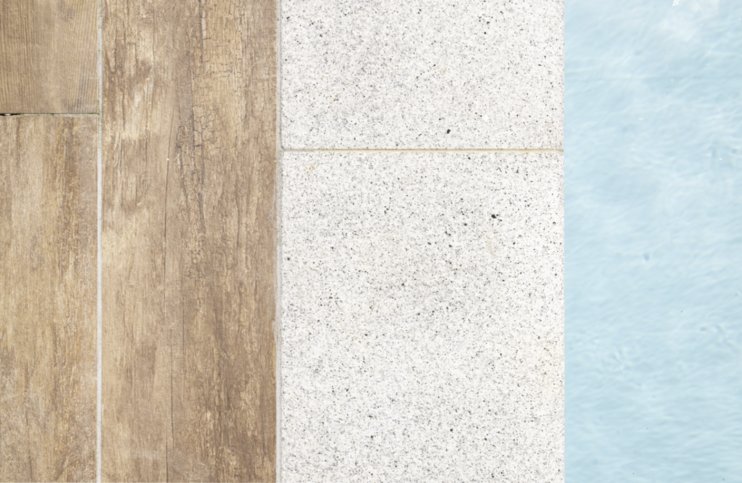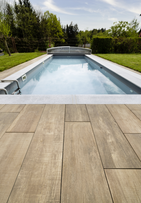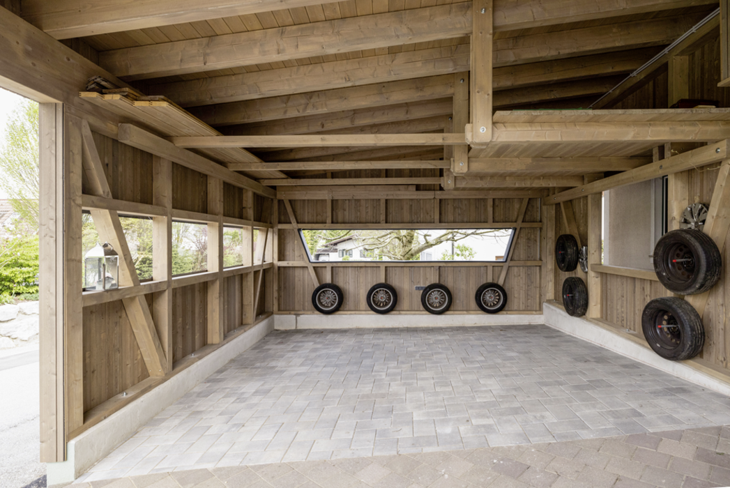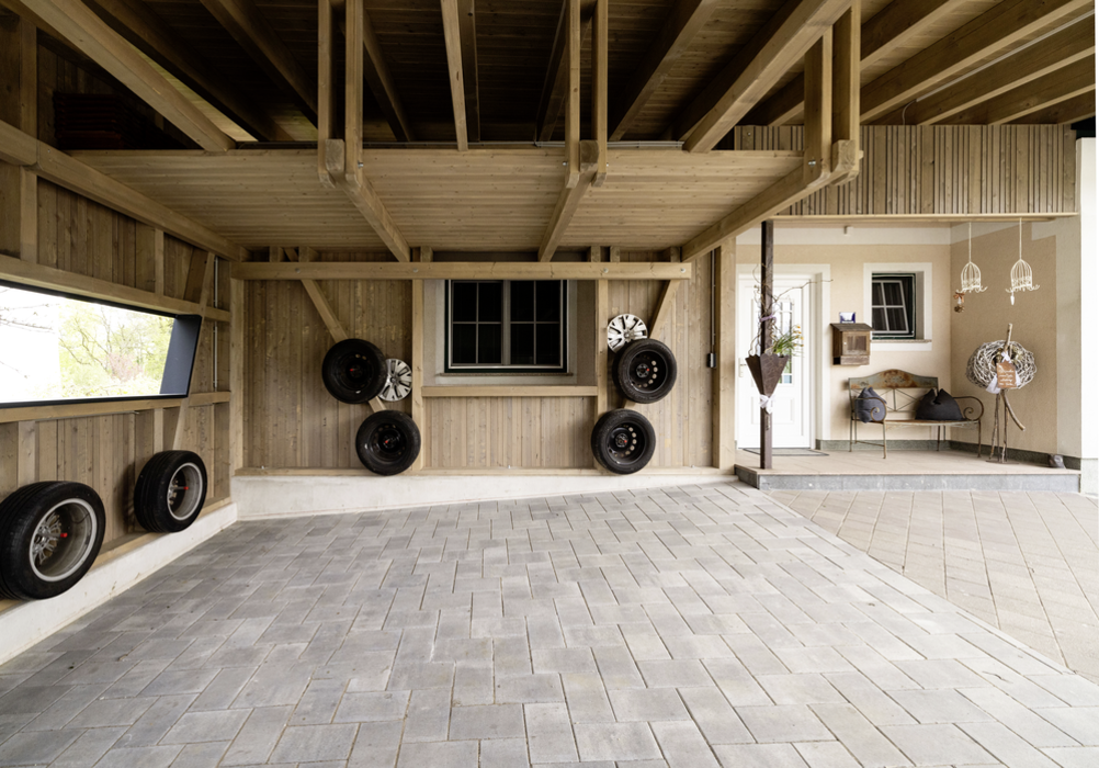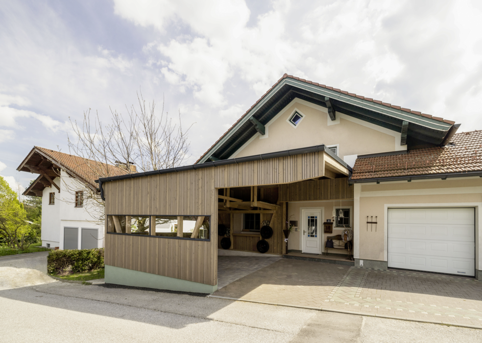 Nicht nur im Innenbereich, auch im Außenbereich des Einfamilienhauses wurden unterschiedliche Bereiche erneuert. So sorgt eine Terrasse aus Feinsteinzeug für ein angenehmes Gehgefühl auf dem Weg zu einer kühlen Erholung im Pool. Auch ein neues Carport sowie eine Holzhütte bieten Stau- und Unterstellfläche. Verwendet wurden hierfür Brettschichtholz (BSH) sowie Konstruktionsvollholz (KVH) und Profilhölzer mit Nut und Feder. Als Zwischenboden im Carport wurden Brandschutzbretter mit Doppelnut und Feder verwendet. Als Außenverkleidung entschieden sich die Eigentümer für Fassadenprofile in Grau aus Lärche. Dank vieler hochwertiger Materialien, einer professionellen Verarbeitung sowie besonders viel kreativem Gespür ist ein ansprechendes Kleinod entstanden das zum gemütlichen Verweilen einlädt.