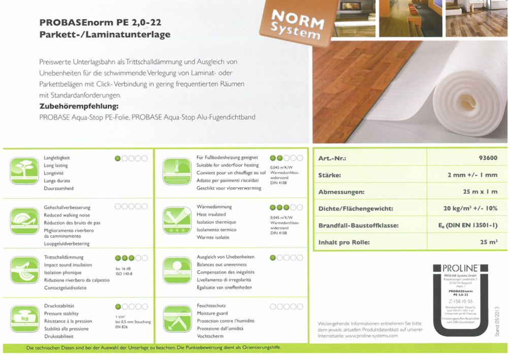 Ob aus Polyethylen oder aus Polystyrol, ob mit oder ohne Aqua-Stop-Dampfsperre, ob gefaltet oder auf der Rolle: Alle PROSAFE Unterlagsmatten eignen sich zum Ausgleich von Unebenheiten unter Parkett- und Laminatböden und glänzen mit hoher Trittschalldämmung und guter Gehschallverbesserung.